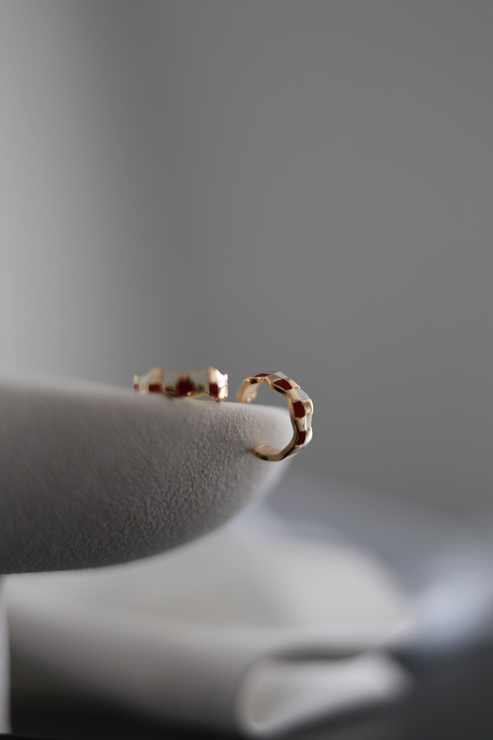 A subtle nod to retro charm, these mini hoop earrings feature a distinctive checkered enamel design in warm red and ivory tones. Crafted with polished gold-plated copper, their slightly wavy profile adds a modern twist to a classic shape — perfect for everyday wear or a playful finishing touch.