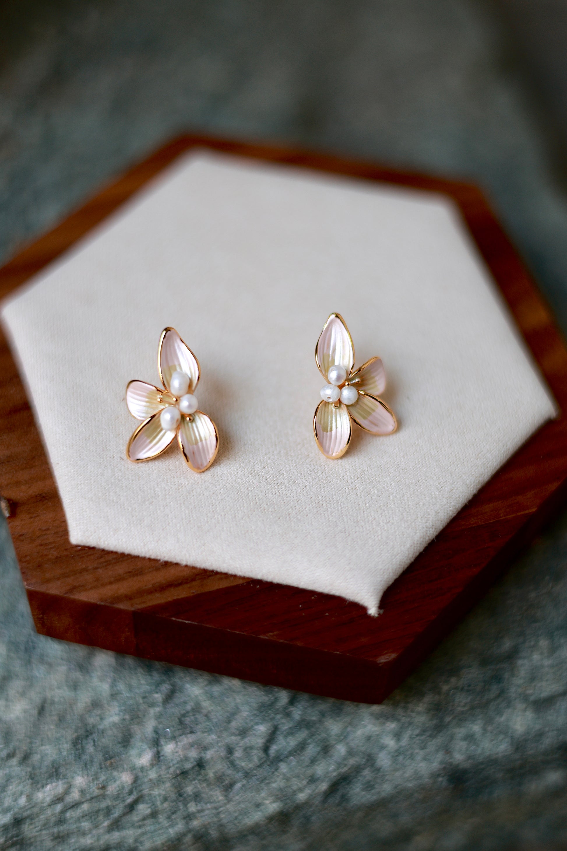 Delicate floral earrings featuring soft pink petals outlined in gold and a luminous pearl center. A timeless piece that captures gentle femininity and refined elegance — perfect for everyday wear or special occasions.